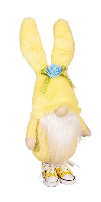 This gnome with bunny ears is super cute and ready to brighten up your spring decor. Complete with plush ears and face with a fabric body, but the best part is the bright yellow converse look high tops!